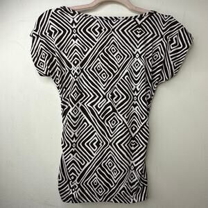 Step back into the early 2000s with this Y2K vintage IZ Byer California top, made in the USA & featuring all the iconic details of the era. This brown & white geometric print short-sleeve top has a soft, stretchy fit with flattering ruching along the sides that hugs the waist & creates a sleek silhouette.