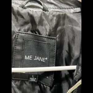 This is a Me Jane black faux leather biker style jacket in size Large for women. It features a sleek and edgy design, perfect for adding a trendy touch to any outfit.