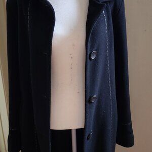Me - Jay - (London, New York, Paris, Milano) Cashmere and wool blend, leather accents; fabric made in Italy, coat made in Canada, long black coat