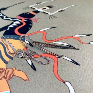 Beautiful, elegant, crisply engraved variegated pattern on 2 willow / feather like sterling silver leaves by Me & Ro. The visually striking 3D linear shape is contemporary, ethnocentric, and organic all at once. This pendant is no longer available from Me & Ro. However, they still make the matching earrings in various sizes. Measures 20" tip to tip opened, leaves are 1.15" and 2" long. Pristine condition. This pendant is a must if you plan to, or already owned the matching earrings.
