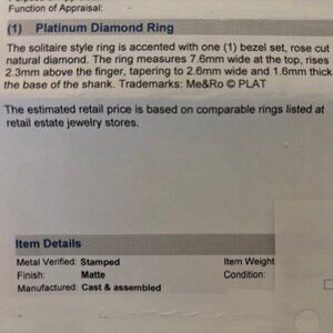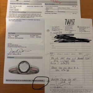 I purchased this ring as an upgrade for my original engagement ring. It no longer fits me and I don't wear a diamond anymore so I want to pass this on. It was purchased from Twist fine jewelry in Seattle in 2009 for $5304 + tax. I had it appraised recently just to find out the quality of the diamond for resale. It was certified by the North American Gemological Laboratory as a .37 ctw clarity: L1 color: E Polish, symmetry: Very good/good. Measurements and specifications are in the photos. Platinum prices and diamond prices have increased since I purchased the ring. Based on the weight of platinum on the date that I had it appraised, the metal alone is worth $1,397.00