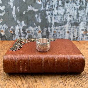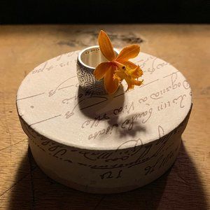 It will make an impression. Beauty and strength--for when you want to, or can only wear just one piece of jewelry, when there's plenty of work to be done, thus simplicity and unfusiness is called for. Me & Ro perennial favorite, etched paisley chunky ring in brushed recycled sterling silver. I wear size 6.25 - 6.5. Excellent condition.
