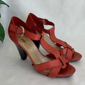 Beautiful black/red strappy leather heels, chunky heel with gold tone hardware - Height: 3.5" Heel, with 0.5" Platform. Woman’s 10M