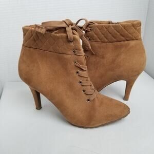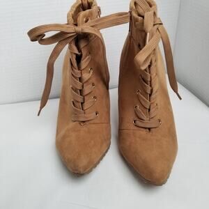 Me Too "Francis" Tan Suede Lace Up Zipper 3 1/2 in Heel Ankle Boot Size 8.5M -PO