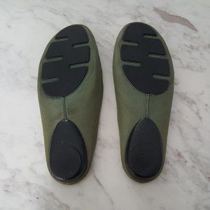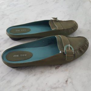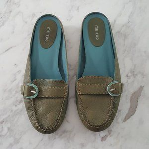 Blueish green faux leather mules by Me Too. Mules are accented with metal buckles and tan stitching.
