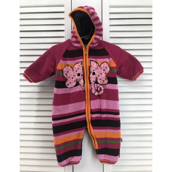 Me Too Size 3-6M striped Sweater Zip Up hooded Romper with elephant appliqué fleece lined