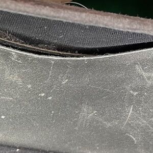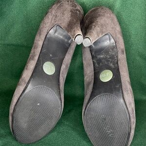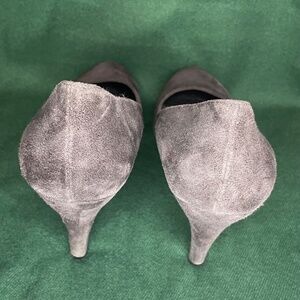 Platform style with little wear on outer suede. Slight inner separation on right footbed . See photos.