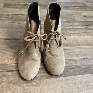 Me Too Size 8 Suede Tan Booties 3 inch heels, tie front Excellent Condition