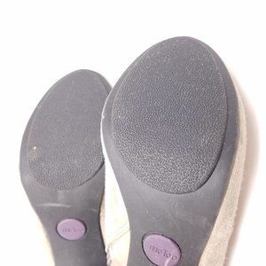 Me Too LASER tan suede platform booties. inside ankle zipper. pointed toe. suede covers the platform and the heel. has rounded over panel that is wide at top of foot and tapers to the heel. padded innersole. sharp looking bootie for parties as well as work.