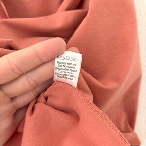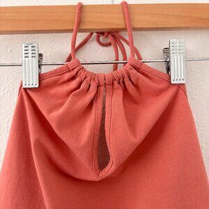Warmer salmon color, halter top, tie neck, keyhole neckline, lightweight material