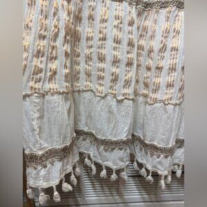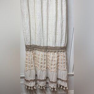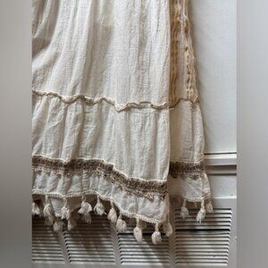 100% cotton, floral eyelet lace and embroidered details, maxi length, lined, partially smocked back, buttoned neckline, short puff sleeves. Light cream/off white and tan. Boho fringe trim.