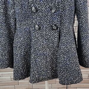 Polyester wool blend blue and black chevron pattern knit double breasted peacoat. Fitted at the waist and gives way to a gathered skirt like hemline with a sailor collar. Good pre-owned condition but showing signs of wear. The wool in this jacket likes to pile.