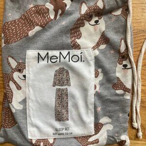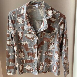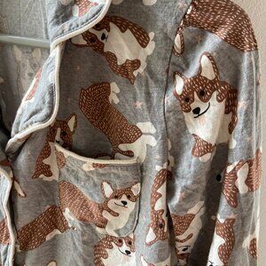 Brand new, button-down, long sleeve top with matching elastic-waist long pant bottoms. Corgis all over! Purchased these to donate for an animal fundraising event that never took place, so I'm selling. Pajamas will come folded up in a drawstring, tie up pouch (and may be a little wrinkled from being stored in the pouch). Colors are grey, brown and white.