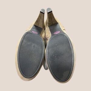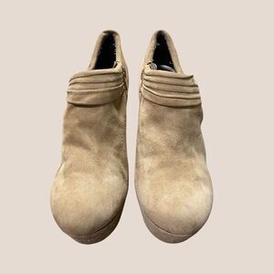 Cute! pair of Me Too women's tan, suede, leather, platform ankle booties with side zipper. Platform: 1" Heel: 4"