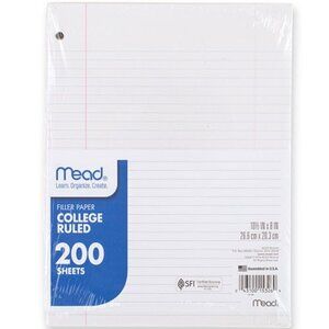 Mead Filler Paper 8"X10-1/2" College Ruled 200 Sheets White School Office Home