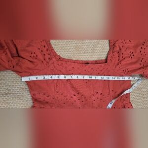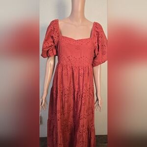 This elegant red eyelet maxi dress is perfect for any occasion. Its intricate design and flowing silhouette offer both style and comfort. A must-have addition to your wardrobe.
