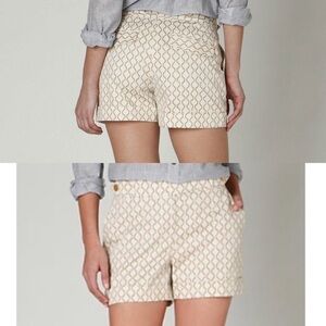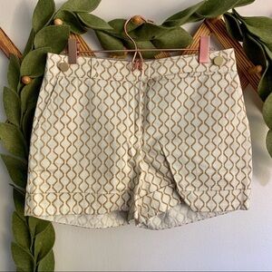 In excellent condition cream color shorts with gold print. Has pockets and a tab and zip front