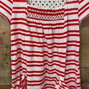 Meadow Rue for Anthropologie Marin Top. Red and white stripes. Short sleeve. Low apron style pockets. Scoop neckline with smocked detail. Eyelet lace upper on back. No visible signs of wear. Size large measures 18” across from underarm to underarm. 28” long from shoulder in front, back is 3” longer. Stock photo in a different color to show how it looks on only. Cotton polyester blend. Machine wash.