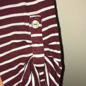 Maroon top w/ white stripes. Fringed material by the collar. Lace detailing in the back.