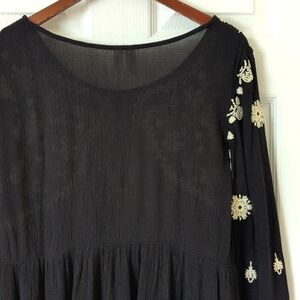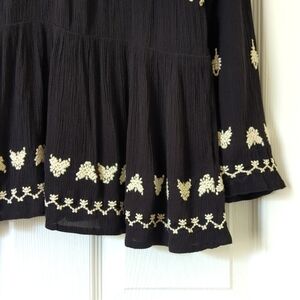 This beautiful top features a henley scoop neck, quarter length flared sleeves, and a peplum hem. It is black with an intricate cream floral embroidery across the yoke, down the sleeves, and around the hem. It has an oversized, relaxed fit that is lightweight and comfortable. Perfect to pair with dark wash flared jeans for a casual bohemian boho chic look! A stunning piece for Fall and Winter! High quality!
