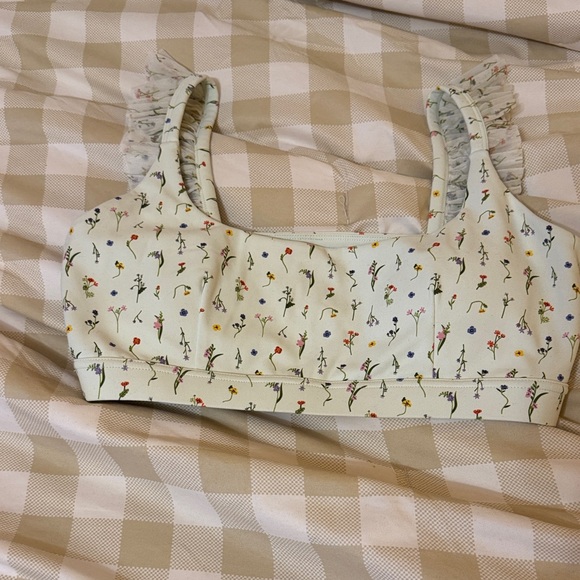 Charming bralette with floral print and ruffle straps. Perfect for a casual look.