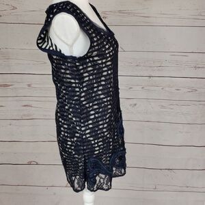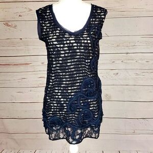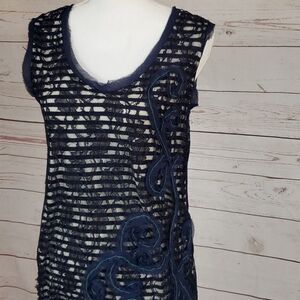 Striped tank underneath lace overlay. Embroidered swirling embellishment on front. Raw edges on embellishment, neckline and arm holes. Shell: 80% viscose, 20% nylon. Lining 100% modal. Some stretch to fabric. Hand wash. Lay flat to dry. Approximate measurements: chest 17”, length 31”.