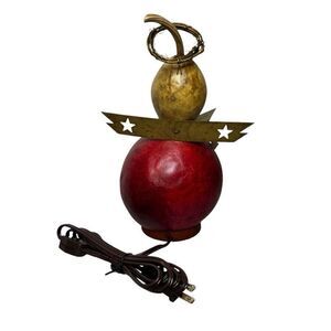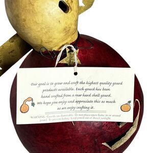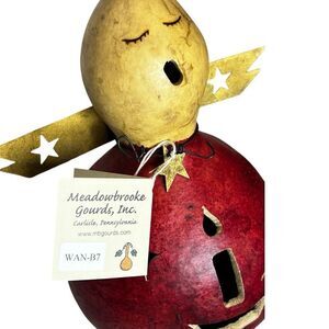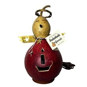 Gooseneck gourd lovely red angel with a candle cutout. She has a natural-colored face with a red body and gold colored metal wings with star cutouts and halo. Comes with an electric light, red bulb included.