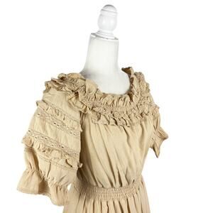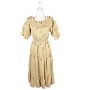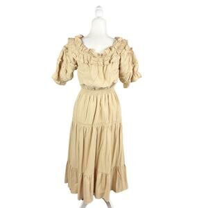 Midi length dress with an off-shoulder frill neckline and elasticated neck