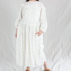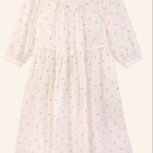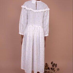 Knee length loose fitting dress with a round neckline fastened with a button at the back. With long sleeves and an elasticated cuff. In our Daisy Embroidery print on a white base.