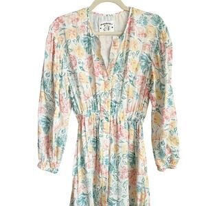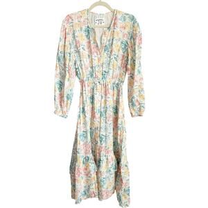 Our floral obsession continues with the Statice midi length floral dress featuring an elasticated waist and cuff, round neckline, tiered hem and buttons down the front.