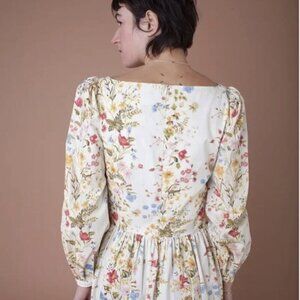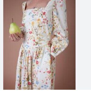 Long sleeve maxi dress with a square neckline, pockets, gathered v-waistline and front darts. Slightly puffed shoulders and full sleeves, gathered into a small cuff and fastened with a button. In a crisp cotton poplin with a painted floral print on a cream base colour. 100% Cotton