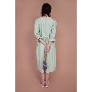 The Hazel Dress in a soft sage is a midi length dress with a dropped gathered waistline for a relaxed fit. Featuring a round neckline fastened with a zip down the back, and 3/4 length sleeves with an elasticated cuff and embroidered floral detailing. Made from 100% organic cotton, designed by Meadows.