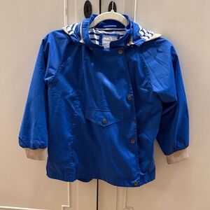 Chic blue rain jacket by Meanbear featuring a striped lining. Perfect for casual wear.