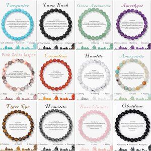 Features: This set includes a variety of stones like rose quartz, tiger eye, lava, amethyst, turquoise, aventurine, carnelian, howlite, hematite, obsidian, and more. Each bracelet features 8mm polished beads with a smooth, comfortable feel. Comes with meaningful cards that highlight each stone’s energy and symbolism — perfect for inspiring confidence, balance, and hope.