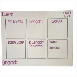 @april_weller I can! It can be customized for just about any category! I'd just need to know what specifically you'd like it to include or I could do Item/New?/Brand and then in the boxes, we'd do Size/Waist/Inseam/Rise/Leg Opening/Callouts & Notes.