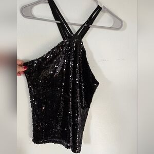Meaveor Lined Black Sequin Tank Halter neck style. Straps are adjustable Fully lined