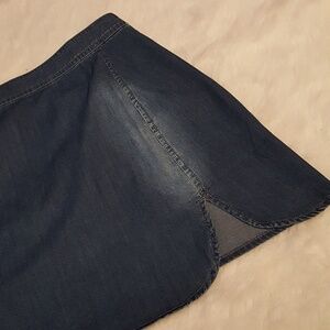Mebon - Blue Jean Faded Mini Skirt. Lightweight. Faded front and back. Zip up back. Scalloped detail on front. 15 inch flat lay waist 15.5 in long.