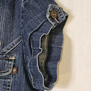 Introducing the Mecca Femme Y2k Blue Denim Retro Button Down Jumsuit in size 7/8. This one-piece jumpsuit features a flattering scoop neckline, short sleeves, and a straight leg style. The denim fabric is made of a blend of polyester, spandex, and cotton, making it both comfortable and durable.