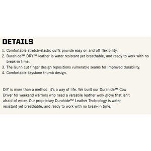 Durahide™ DRY™ leather is water resistant yet breathable, and ready to work with no break-in time.