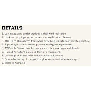 Micro-fleece lines the entire glove and 40g 3M Thinsulate traps warm air to help regulate your body temperature in the bitter cold. Stay connected to your touchscreen devices, without removing your gloves, with AX Double Connect on your index finger and thumb.