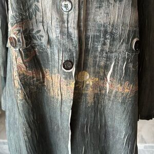 Unique gray floral coat with subtle pleating throughout, a high neckline and buttoned patch pockets. “Wildrose” is on the front & back.