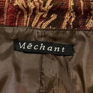 Mechant.  Sz Small.  Floral Tapestry Button Up Lined Jacket.  Long Sleeve. 3 Faux Pockets.  Bound button holes.  Poly/Rayon.  Center back 20".  Sleeve 20.7".  Bust 35.4".  Excellent pre-loved condition.  No spots, tears or damage.