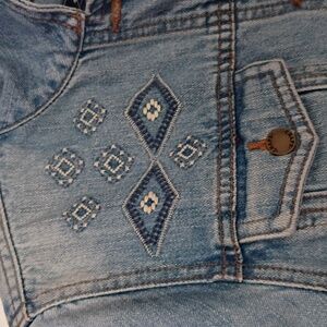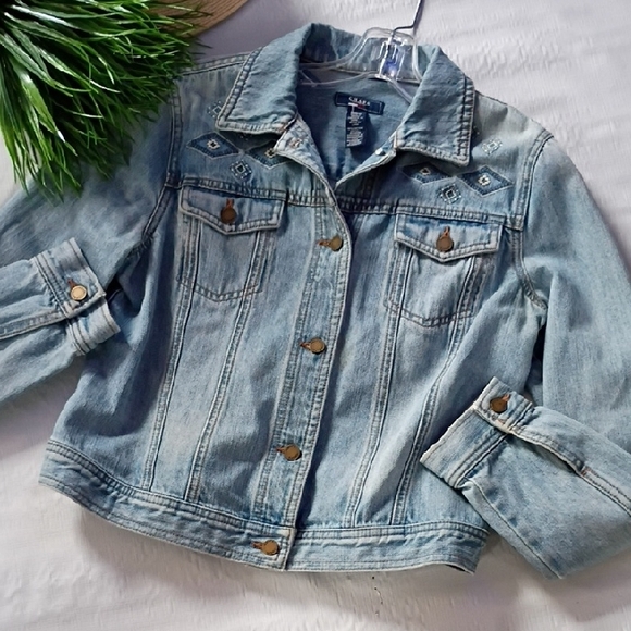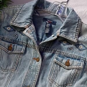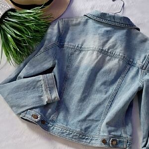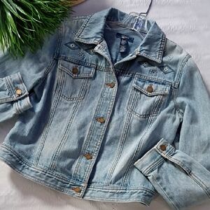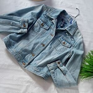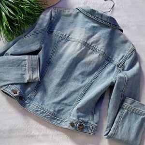 Stylish light blue jean jacket. Features button closure. Classic design with front pockets. nwot size med ptp 20 length 21 all pockets functional
