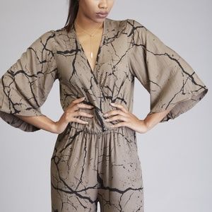 The distinctive taupe color, overlaid with a stormy, crackled print, goes with just about any shade of shoes, handbag and jewelry. The relaxed fit, elastic waist and wide dolman sleeves ensure that you will step out in comfort as well as style. The jumpsuit's flowy fabric and design still show off your curves to create a soft, sexy style.