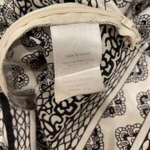 Talbots Medallion Shell, Black and White, Size Medium. This stylish sleeveless top features a geometric medallion pattern and black piping details. Perfect for adding a sophisticated touch to any outfit. Made from 100% polyester, it's machine washable and easy to care for. Excellent pre-owned condition, no visible flaws.
