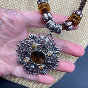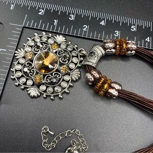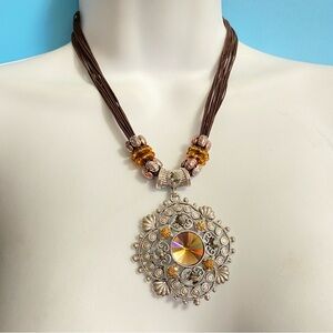 Medallion Silver Tone Pendant Rhinestones Necklace. Measures approx 17" + 3.5" extender chain. On 15 strand silk cording. Very good condition, appears only gently worn if at all. #13
