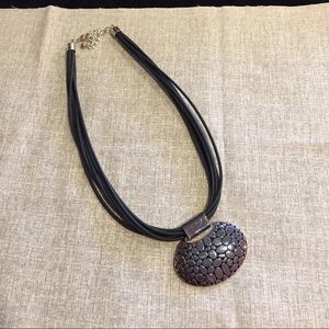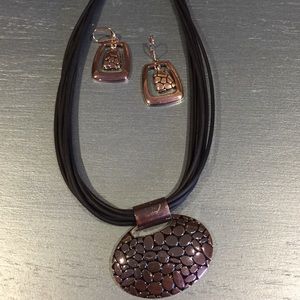 Multi-strand black with silver and black medallion; matching silver and black earrings