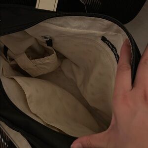 This stylish tote bag features a sleek black design with elegant cream accents. Perfect for any occasion, it combines fashion with functionality.