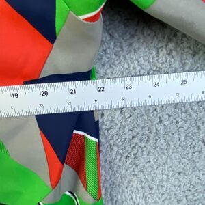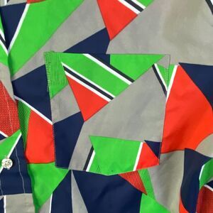 This is a vintage Media Quintessa men's shirt in size Large, featuring a collared neckline and long sleeves. The shirt is made of 100% polyester material in a blue color with a geometric pattern. It has a regular fit and button-up closure with button accents. The shirt is lightweight and suitable for all seasons, making it ideal for both casual and party/cocktail occasions. It is part of the Media Quintessa product line and has a colorful outdoor theme.