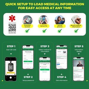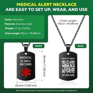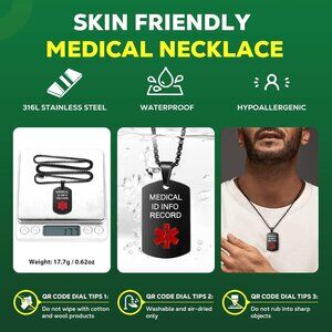 Features: This unisex medical ID necklace is made from high-quality stainless steel, with a polished black rectangular pendant showcasing a built-in QR code. The rolo chain has a sturdy lobster clasp, perfect for everyday wear. The QR code stores extensive medical info, easily updating online without needing an app—just scan and set your details. It's waterproof, rust-resistant, and comfortable for daily use. Ideal for anyone with health conditions, allergies, or transplant needs who wants quick access to critical info.